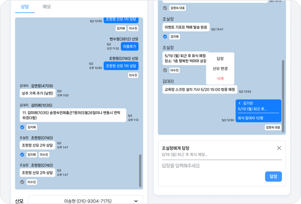 채팅창 안에서 모든 대화와 업무 내역을 실시간으로 공유할 수 있고 누가 해당 내용을 확인했는지 표시 되어 중요한 상담 기록을 놓치지 않고 공유할 수 있습니다.