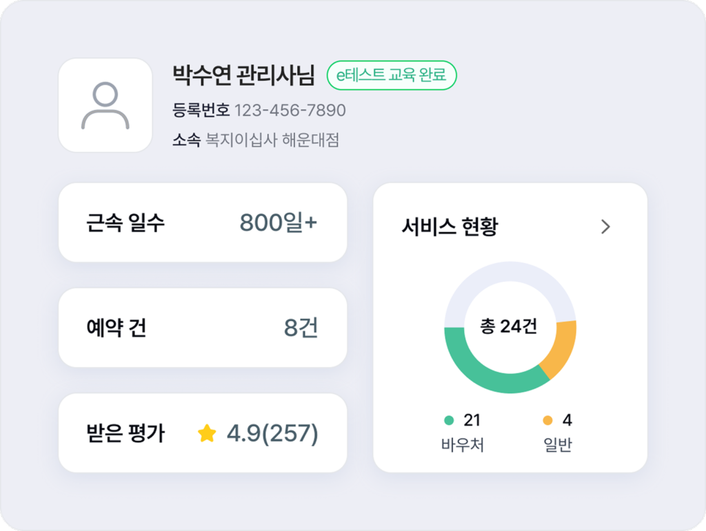 제공인력 배정 현황, 서비스 예약 건수, 서비스 추이 등 주요 운영 데이터를 대시보드에서 실시간으로 확인하고 기관 운영 현황을 빠르게 파악하고 개선이 필요한 영역을 쉽게 확인 해보세요.
