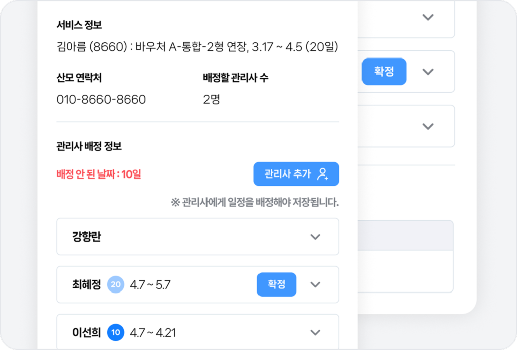관리사의 일정(서비스파견, 휴가 등)이 있는 날 서비스 배정시 배정할 수 없도록 알람이 뜹니다.