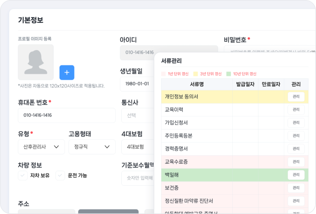 제공인력의 자격증, 보수 교육, 근무 기록을 한곳에 저장합니다. 자동 알림 기능으로 휴가 신청 및 승인 과정을 신속하게 처리할 수 있습니다.