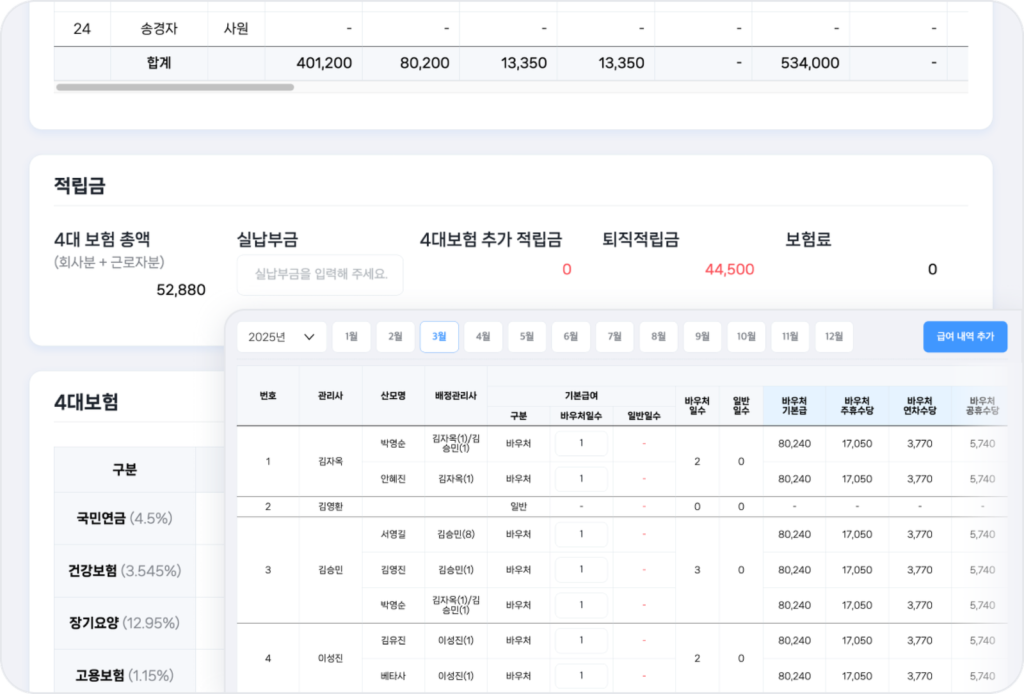 제공인력을 배정하면 직원별 근무, 휴가, 초과수당 데이터를 통합해 매월 스트레스 없이 정산 업무를 끝낼 수 있습니다. 세금과 4대 보험 공제까지 포함된 급여 보고서를 제공합니다.